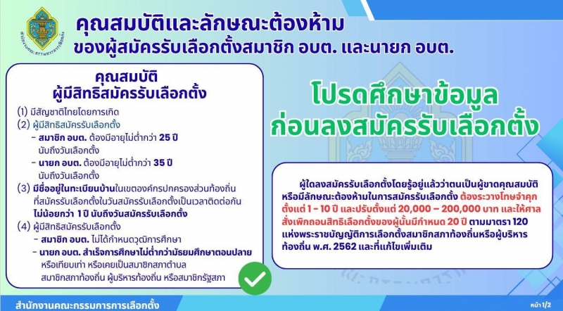 ประชาสัมพันธ์คุณสมบัติและลักษณะต้องห้ามของผู้สมัครรับเลือกตั้งสมาชิกสภา อบต. และ นายก อบต.